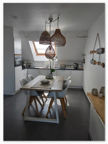 Cuisine ouverte complètement équipée avec four combi (micro-onde - four), frigo et lave-vaisselle, machine expresso Delonghi, ustensiles de cuisine, toaster, presse jus, ...