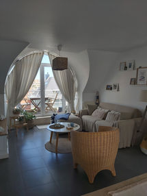Séjour agréable avec vue dégagée donnant sur la terrasse et la mer, avec canapé-lit pour 2 personnes (140cm x 200cm - 1x couette 2 pers).